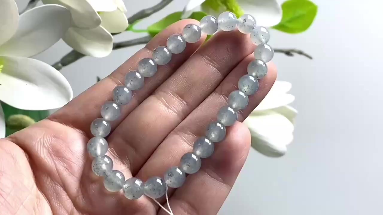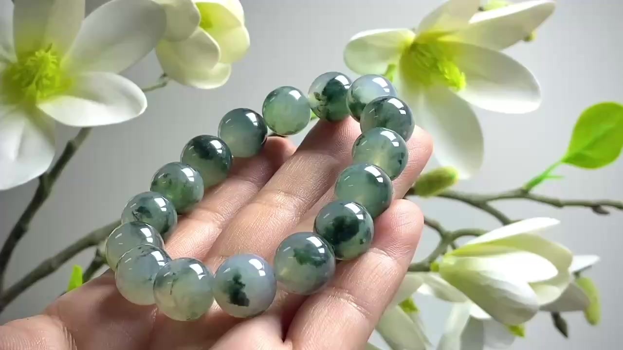 $:8000,冰飘花圆珠手串,冰冰润润,花色像水墨画,尺寸卡:12.8