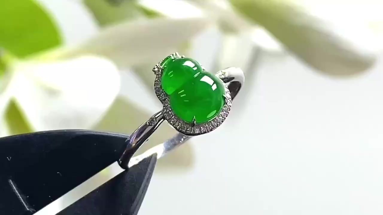 $:13000,18K金镶嵌阳绿葫芦戒指,色辣够冰,完美,裸石尺寸:9*6.8*3.7,圈口16号,(大小可改)